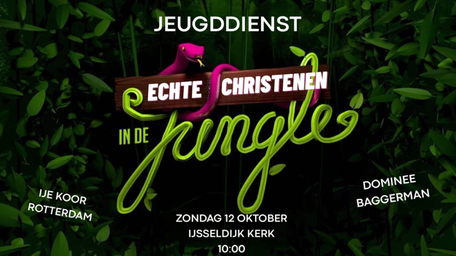Wat een enthousiasme was er op 12 oktober bij de Jeugddienst met een sketch van een TV-programma met de titel "Christenen in de Jungle" (met presentatoren die zó bij de landelijke TV kunnen beginnen), die ons duidelijk maakte hoe je een ‘echte’ christen kunt herkennen én m.m.v. het IJE-koor uit Rotterdam.